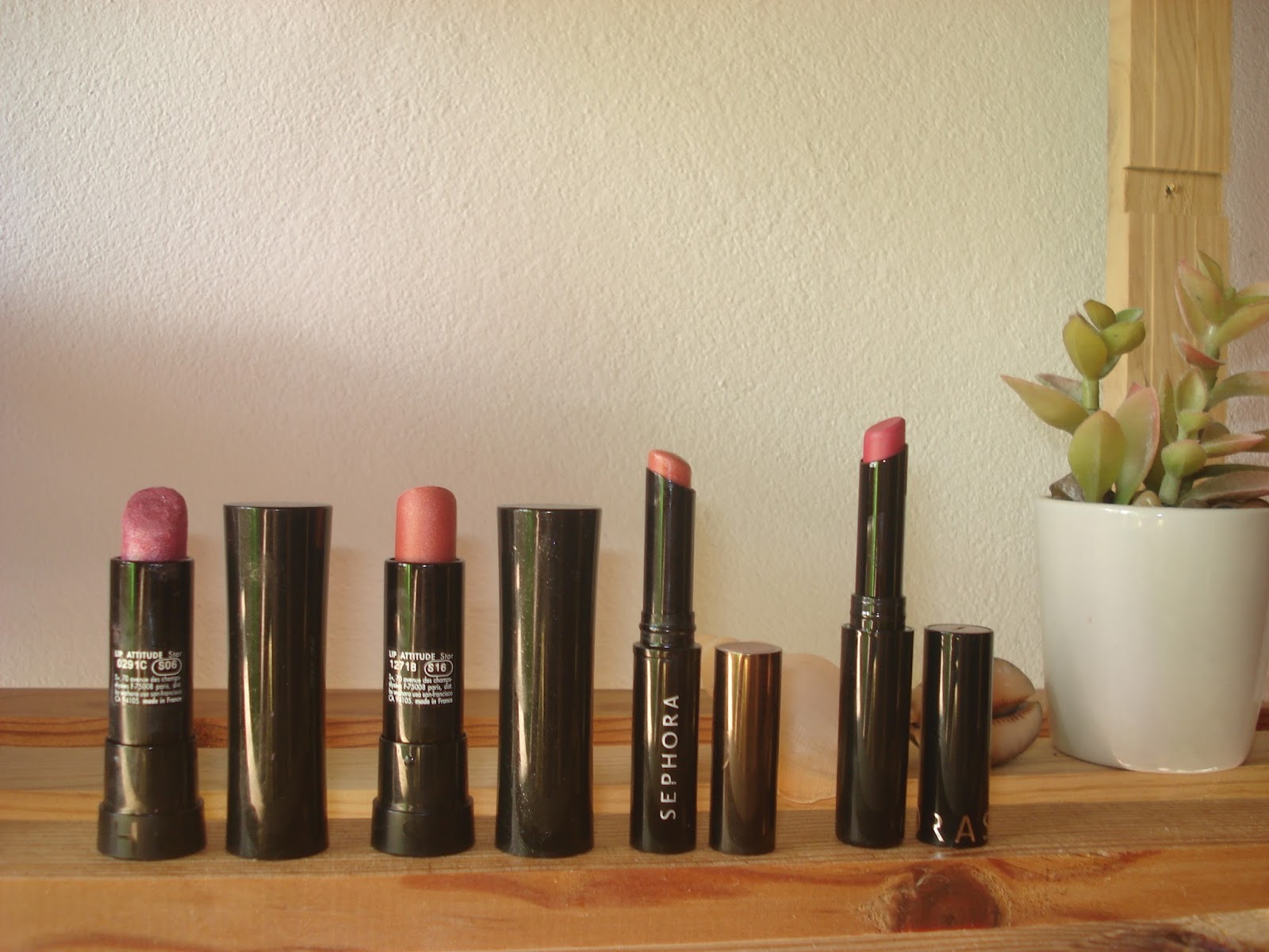 Estes são da linha Lip Attitude Star. O primeiro numa cor mais rosada de fundo acastanhado e shimmer dourado (Ref: 029 1C , S06), o segundo um nude castanho luminoso também com shimmer (Ref: 127 1B, S16). O rosa está um caco, cai e volta a cair e eu vou reconstruindo o que posso. Gosto demasiado dele para simplesmente deitá-lo fora.